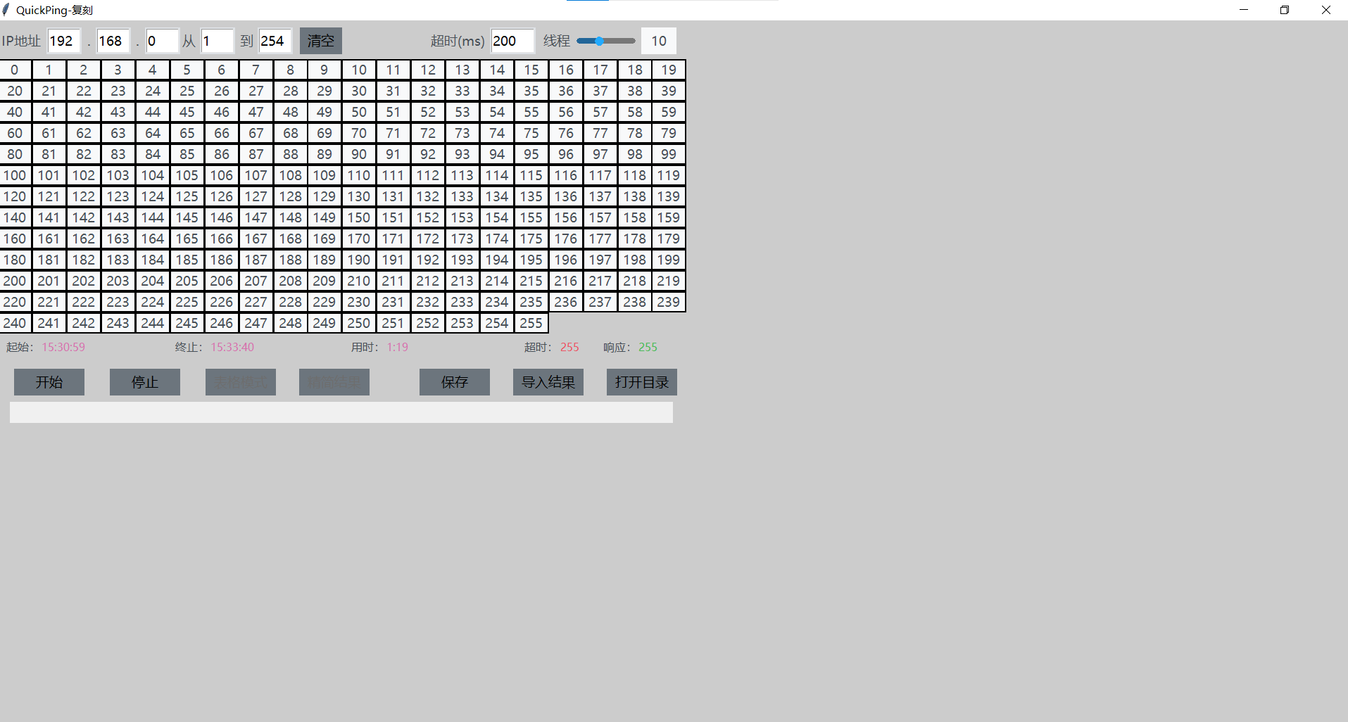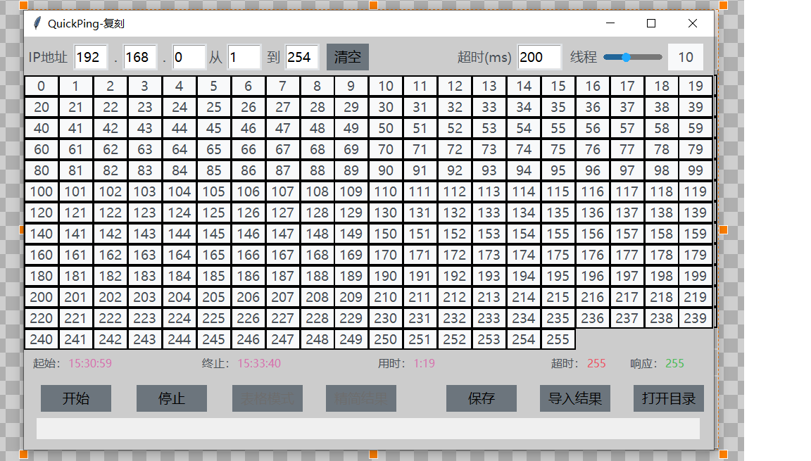 手搓复刻了quickping的界面,一共用了4个frame,中间的0~255是用label标签手工排出来的,现在界面放大不会变化,感觉应该还有更好的办法,求指定。